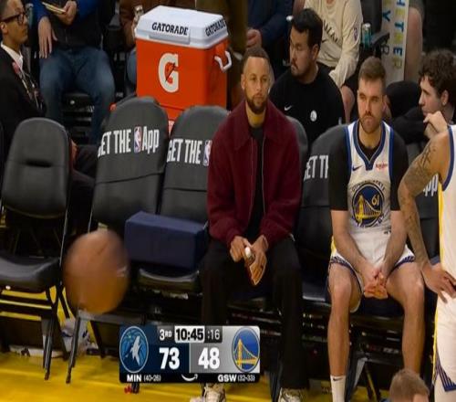 第三节开场勇士大比分落后库里在场边坐着眼神很空洞,这时候替补席只剩下库里、斯潘塞、莱昂斯三人(实际上算2.5人因为库里不能打)。