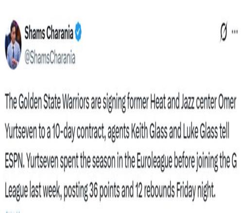 北京时间3月15日,据名记Shams报道,勇士将以一份10天短合同签下自由球员中锋尤尔特塞文,经纪人证实了这一消息。