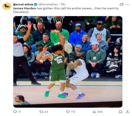 哈登疼得倒地不起,裁判没有任何表示,雄鹿这边都直接下快攻了,可哈登轻伤不下火线。哈登就带着脚踝伤势鏖战了33分30秒。