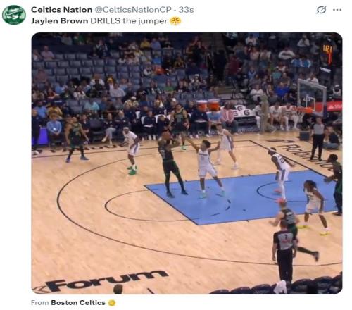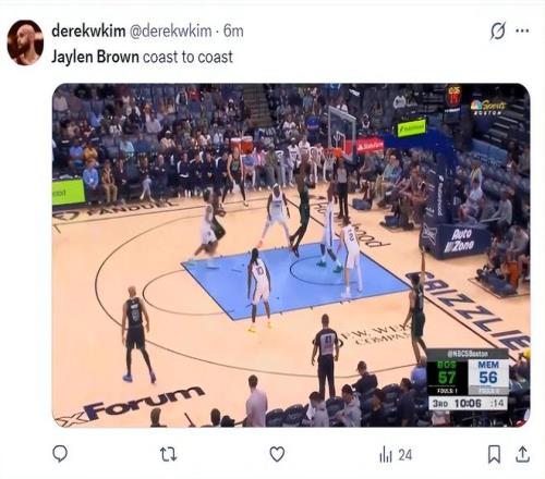 第二节布朗抢下后场篮板后一条龙各种闪转腾挪上篮命中,单节6中3+三分3中2拿到10分2篮板2助攻,半场布朗16分4篮板2助攻1抢断,而塔图姆半场10中1+三分7中1铁出天际。