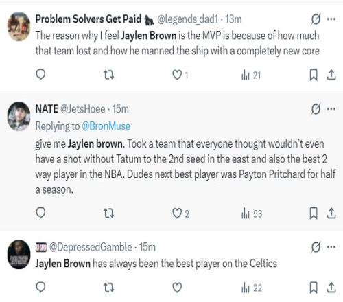 绿凯球迷:1.我之所以认为布朗才是MVP,是因为这支球队遭遇了重大打击,布朗带着全新的阵容依旧是东部劲旅;