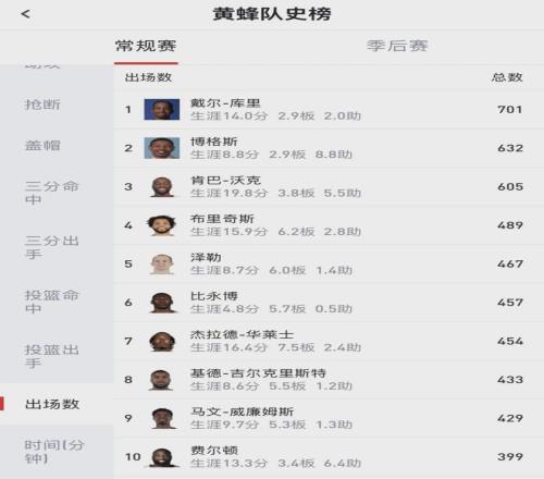 我们搞清楚了球队历史,再来聊聊戴尔-库里。他在黄蜂时期的总得分(9839)排名队史第二,仅次于肯巴-沃克(12009)。戴尔-库里的三分命中数(929)和投篮命中数(3951),同样排名队史第二。出场数701,黄蜂队史第一。