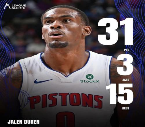再往前,赛季初坎宁安缺席期间,杜伦还曾对阵步行者打出当时的生涯之夜:全场出战29分钟,投篮13中12,得到31分15篮板3盖帽,这是他生涯第一次30+15。