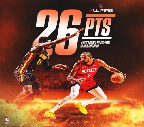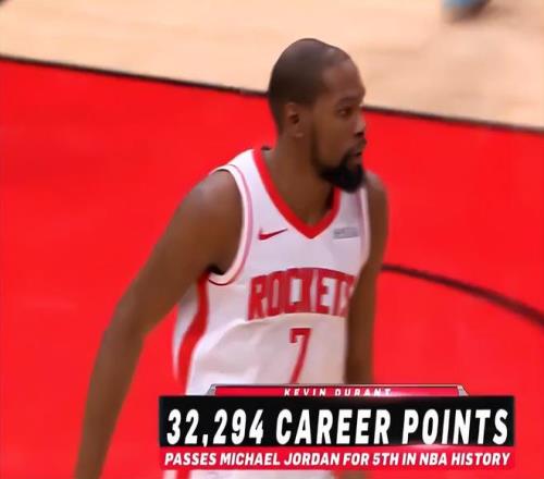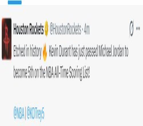 火箭官方:铭刻于历史之中的杜兰特,他刚刚在总得分上超越乔丹成为NBA历史得分榜排名第五的球员。