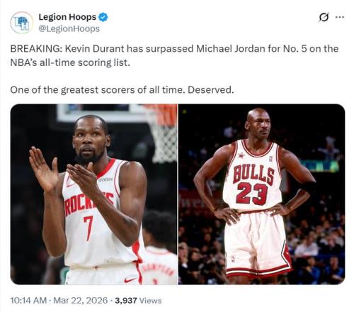 美媒LH写道:杜兰特总得分正式超越迈克尔-乔丹升至NBA历史得分榜第五位。他是有史以来最出色的得分手之一!当之无愧。