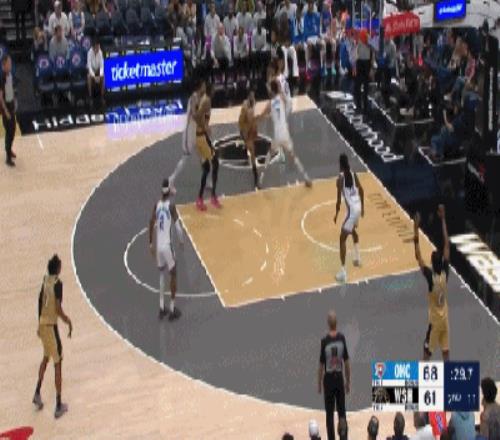 尚帕尼且战且退,吉尔就惨了,被雷霆众人 摁倒在地一顿输出。(身穿16号球衣的正是吉尔,真的惨)