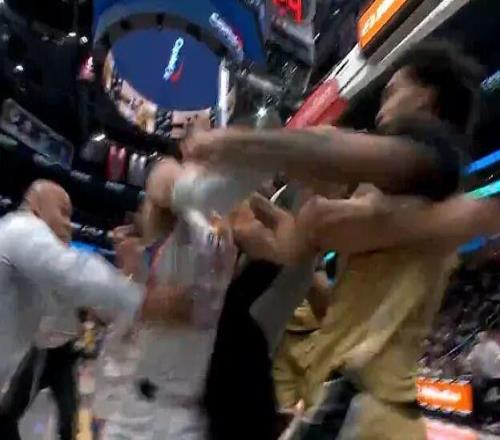 此时,雷霆的米切尔赶紧上前助阵,尚帕尼眼瞅对方人多,抬手进行防御性进攻,一掌打了米切尔的脸。被当众打脸的米切尔如猛虎出匣,眼见就要扑倒尚帕尼,尚帕尼在裁判掩护下且战且退。