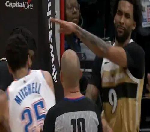 也不知道杰林威想干嘛,拿着球就和站在底线的尚帕尼玩起了顶牛推搡,裁判见状迅速分开了两人。