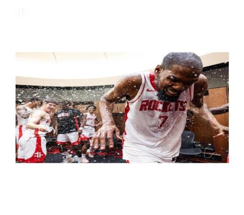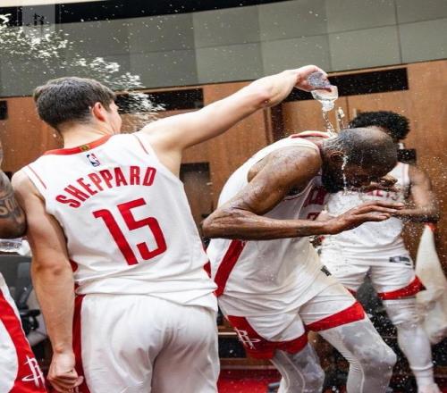 突然之间,队友们一人手中拿着几个矿泉水瓶,就给他来了个醍醐灌顶,NBA赛场最常见的泼水礼庆祝!