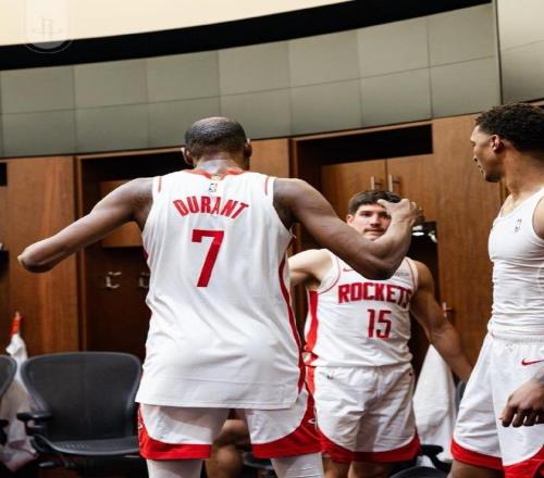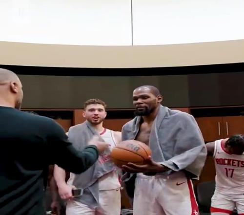 火箭主教练乌度卡将比赛用球交给了杜兰特,向他表示祝贺。