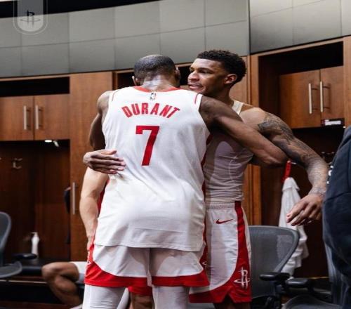 赛后回到更衣室里,杜兰特和队员们依次拥抱,接受大家的祝贺。