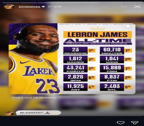 北京时间3月23日,詹姆斯更新社媒即时动态,转发了NBA官方发布的关于他生涯历史纪录的帖子,并配文:“心怀感恩”