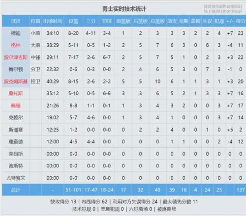 勇士本场10人轮换,除了梅尔顿和斯潘塞之外,其余8人得分上双:穆迪23分、波尔津吉斯22分、波杰姆斯基20分、小佩顿17分、桑托斯16分、LJ-克赖尔14分、追梦11分、理查德10分。梅尔顿6中0,仅得0分6板5助3断7失误。