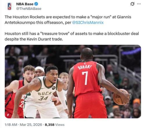 《体育画报》名记Chris Mannix跟进曝出,火箭队预计将在休赛期全力追求超级巨星字母哥。