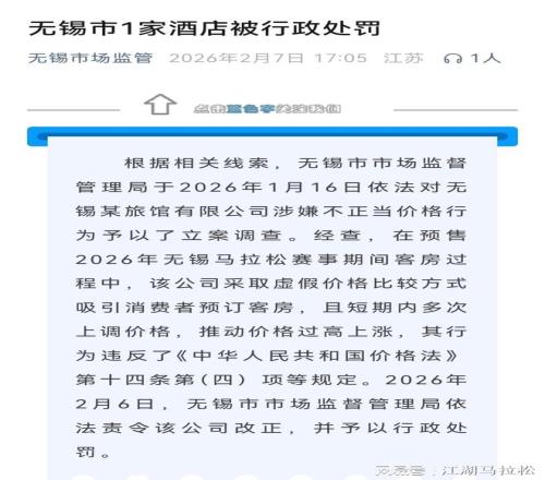 无锡市市场监督管理局在1月16日对蠡湖之星旅馆有限公司涉嫌在今年锡马期间存在的宾馆酒店价格不正当行为进行立案调查。