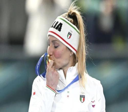 2月7日,意大利选手洛洛布里吉达在颁奖仪式上亲吻金牌。新华社记者 武巍 摄