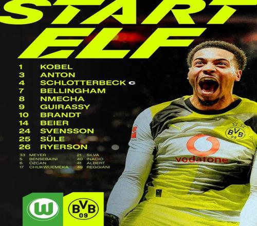北京时间2月7日22:30,德甲第21轮,多特客战沃尔夫斯堡。赛前首发公布。