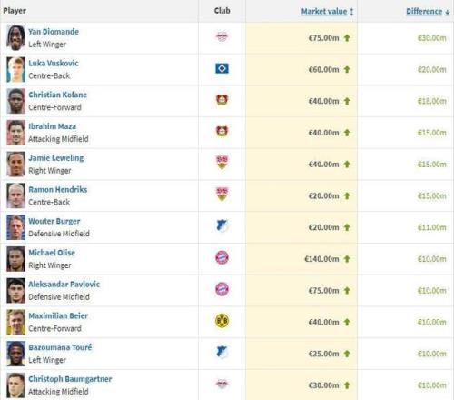 1、扬-迪奥曼德(莱比锡) 上涨3000万欧至7500万欧