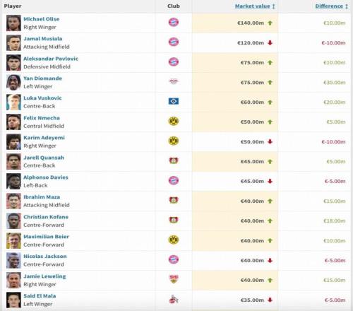 仅两名球员下跌达到1000万欧,分别是拜仁慕尼黑前腰穆西亚拉和多特蒙德边锋阿德耶米。