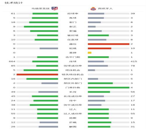 北京时间2月22日西班牙足球甲级联赛 联赛 第25轮,马德里竞技主场对阵西班牙人。上半场,卡雷拉斯破门,瑟洛特扳平比分。下半场,巴埃纳助攻,小西蒙尼帮助马竞反超比分。鲁杰里随后送出两次助攻,卢克曼和瑟洛特相继破门。埃杜远射得分,为客队扳回一城。全场比赛结束,马竞4-2击败西班牙人。
