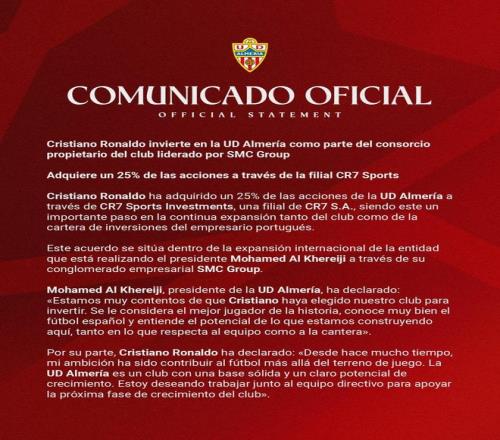 C罗宣布收购了阿尔梅里亚25%的股份,成为了俱乐部的股东之一,从目前的消息来看,C罗应该是不会参与到俱乐部的实际运营当中,他更多是暂时以一个投资者的身份进行的收购,不过关于C罗的投资细节以及投资的金额并没有太多的信息。阿尔梅里亚这支球队关注西甲的球迷还是非常熟悉的,他们算是比较有名的西甲升降机,多次升入西甲联赛但是也多次降级。