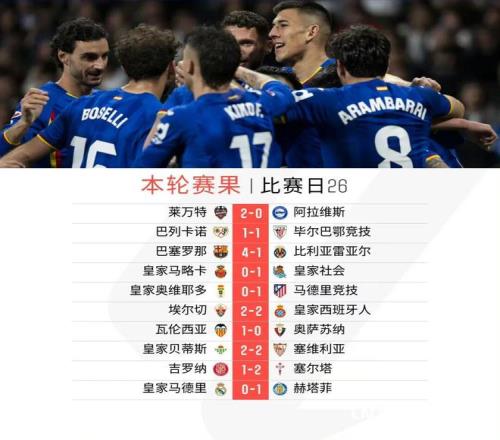 北京时间3月3日凌晨,西甲第26轮最后一场比赛落下帷幕,联赛第二的皇家马德里客场爆冷不敌赫塔费,遭遇联赛两连败,由于此前先赛的巴塞罗那4比1大胜黄潜,巴萨的领先优势扩大至4分;马德里竞技客场1比0击败联赛倒数第一皇家奥维耶多,积分追平比利亚雷亚尔,并凭借净胜球优势反超来到第三位,黄潜落至第四位;皇家贝蒂斯2比2战平塞维利亚后,积43分排名第五,塞尔塔客胜赫罗纳后积40分排名第六。