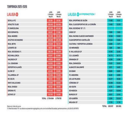 北京时间3月3日,西甲官方公布了各支球队的最新工资帽,其中巴萨的工资帽从3.51亿欧元提高到4.32亿欧,马竞的工资帽从3.269亿欧增加至3.362亿欧,皇马则没有变化。