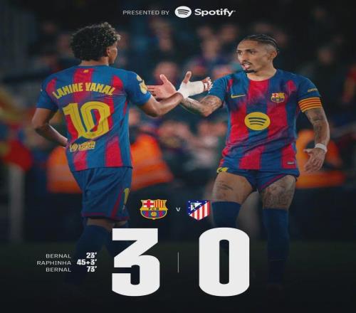 贝尔纳尔的梅开二度、拉菲尼亚的稳健点球,巴萨用最巴萨的方式——传控与压迫,一次次撕扯着马竞的防线。数据不会说谎:射门21-7,射正9-2,控球率71%。这是一场半场攻防演练,巴萨将卫冕冠军逼到了悬崖边上。