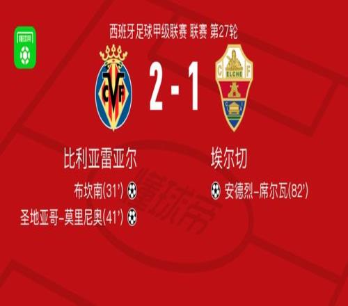 北京时间3月8日西班牙足球甲级联赛 联赛 第27轮,比利亚雷亚尔主场对阵埃尔切。比利亚雷亚尔布坎南破门,圣地亚哥-莫里尼奥破门。埃尔切安德烈-席尔瓦破门。最终比分比利亚雷亚尔 2-1 埃尔切。