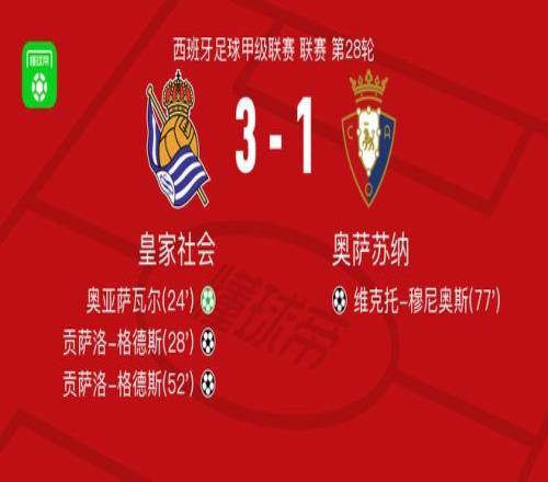 北京时间3月16日西班牙足球甲级联赛 联赛 第28轮,皇家社会主场对阵奥萨苏纳。皇家社会奥亚萨瓦尔破门,贡萨洛-格德斯梅开二度。奥萨苏纳维克托-穆尼奥斯破门。最终比分皇家社会 3-1 奥萨苏纳。
