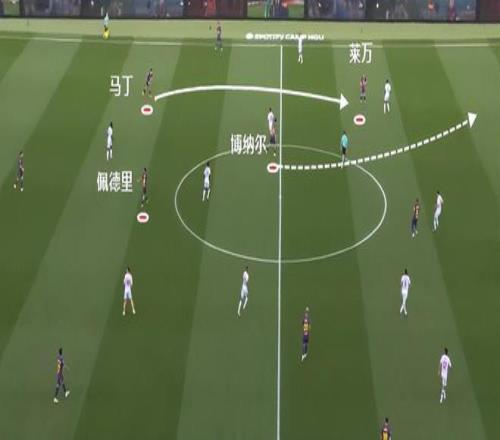 随后的这次进攻中也是一样的道理,莱万接应马丁直塞,这时候博纳尔就往前插了,佩德里再一次处于靠后的位置。