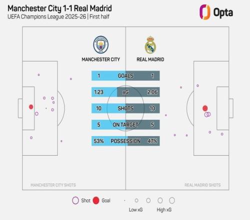 皇马半场预期进球2.06,为有统计以来球队欧冠淘汰赛单场纪录