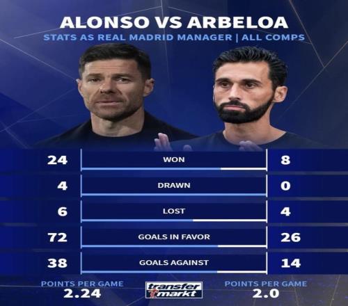 最近德国转会市场把阿隆索和阿韦洛亚执教皇马的一线队数据放到了一起:阿隆索带队34场,24胜4平6负,场均2.24分;阿韦洛亚带队12场,8胜4负,场均2.0分。只看这组账面数字,阿隆索并没有被后来者压过去,至少从结果层面看,“换帅后立刻明显提升”这件事,并没有直接体现在成绩上。(数据截至2026年3月4日)