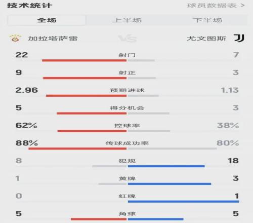 看看这组数据:全场射门22-7,射正9-3,控球率38%。加拉塔萨雷像在训练赛一样肆意穿插尤文的腹地。桑切斯、奥斯梅恩、诺阿·朗,甚至是被尤文旧将“羞辱”的萨拉,每个人都在尤文的禁区内跳舞。
