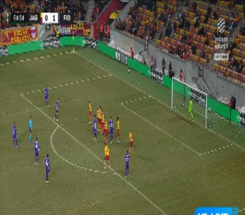 第66分钟,曼德拉戈拉任意球打门,皮球直挂死角,雅盖隆0-2佛罗伦萨