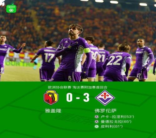 北京时间2月20日欧洲协会联赛 淘汰赛附加赛首回合,雅盖隆对阵佛罗伦萨。下半场卢卡-拉涅利破门首开纪录,随后曼德拉戈拉任意球破门,皮科利造点亲自主罚打进再下一城。最终比分雅盖隆 0-3 佛罗伦萨。