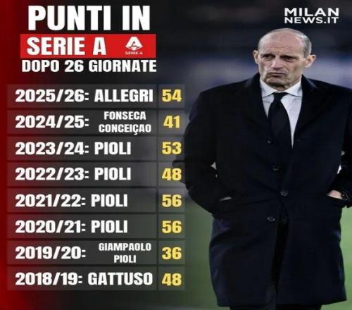 本赛季AC米兰在前26轮意甲过后积分54分,此数据比上赛季同期提升明显,以下为近几个赛季AC米兰在26轮后同期积分情况: