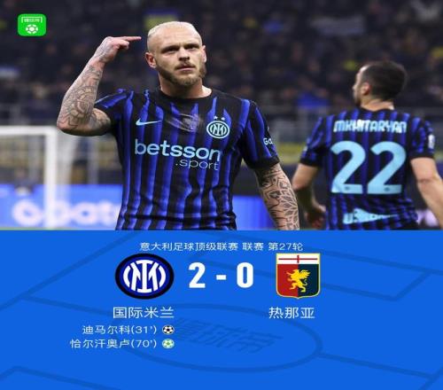 北京时间3月1日意大利足球顶级联赛第27轮,国际米兰主场对阵热那亚。上半场,姆希塔良助攻,迪马尔科凌空破门。下半场,路易斯-恩里克造点,恰尔汗奥卢主罚命中。全场比赛结束,国米2-0战胜热那亚。