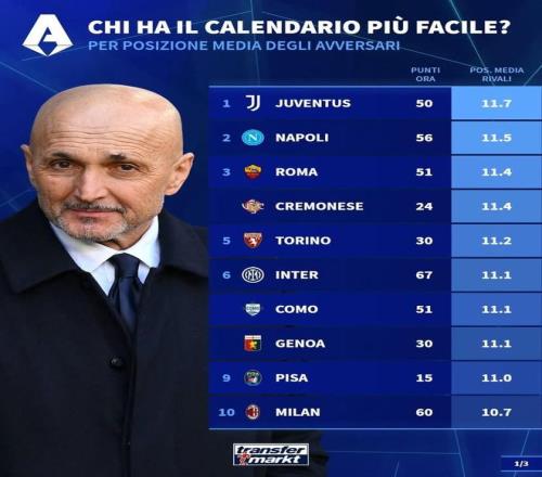 北京时间3月11日,德转统计出了本赛季意甲剩余10轮各支球队将会遭遇的对手在联赛中的平均排名,其中尤文图斯的最后10个对手目前平均排名第11.7位,为所有球队最低。目前7分优势领跑积分榜的国际米兰最后10轮对手的平均排名则为11.1位。