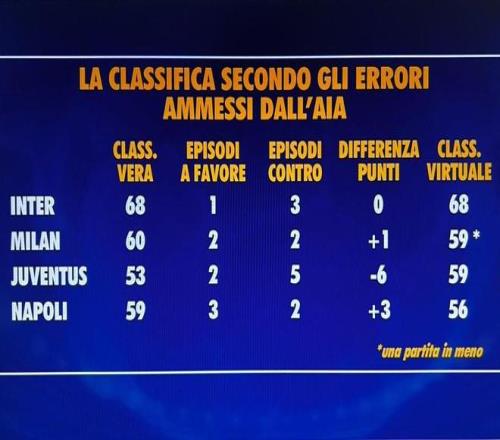 计算误判得失后意甲积分榜前四: