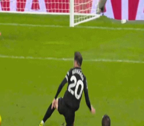 上半场补时阶段,德拉古辛后场传球失误,罗德里断球直塞,贝尔纳多-席尔瓦禁区内铲传,无人盯防的塞梅尼奥轻松推射破门。进球之后,塞梅尼奥空翻庆祝,却落地不稳倒在了草坪上。