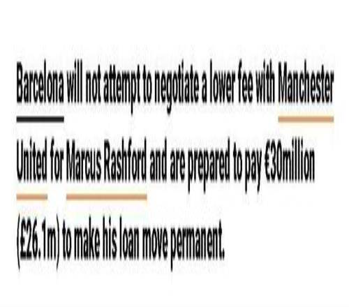 唯一可能导致转会费发生变化的情况是,如果曼联对巴萨阵中任何被认为多余的球员表示出兴趣,双方可以进行交换,但目前还不存在这样的球员。另一个可能影响巴萨买断的是该队换帅,幸好弗里克的帅位似乎颇为稳固,而他非常欣赏拉什福德,力主引进。