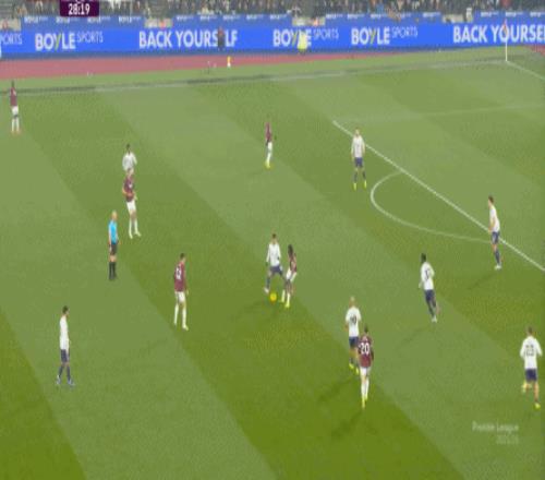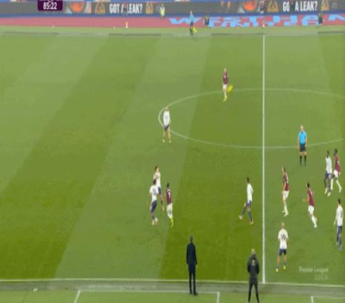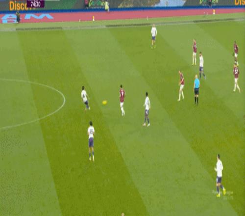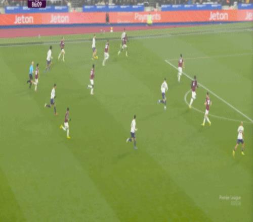 到了这个时候,此前在一周一赛时被掩盖的问题就会浮出水面,比如这次推进,好不容易打出了速度,但到了弱侧,你也不知道是达洛特传大了,还是阿玛德-迪亚洛追不上了,反正一次很好的推进变成了西汉姆联的门球: