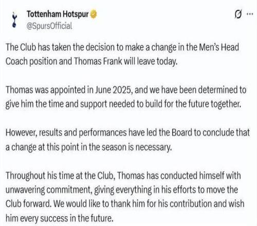 北京时间2月11日傍晚18点20分,热刺官方发布公告:托马斯·弗兰克不再担任一线队主帅,即刻生效。距离球队1-2输给纽卡斯尔,仅仅过去12个小时。这样一来,52岁的弗兰克,就这样成为本赛季英超第7位正式下课的主帅。前6人分别是:9月,诺丁汉森林解雇努诺,西汉姆送走波特;10月,波斯特科格鲁离开森林;11月,狼队与佩雷拉分道扬镳;1月,切尔西的马雷斯卡、曼联的阿莫林相继下课。