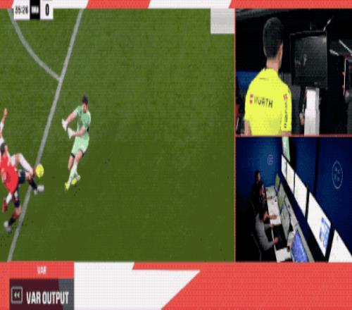 VAR迅速介入,裁判回看后做出改判,取消黄牌,认定库尔图瓦犯规,判罚点球。