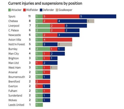 英超各队伤病与停赛情况统计数据显示,托特纳姆热刺目前正遭遇严重的人员危机,以11人的伤停总数位列英超所有球队之首。