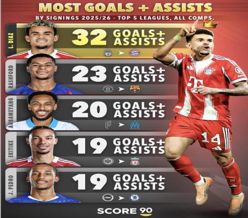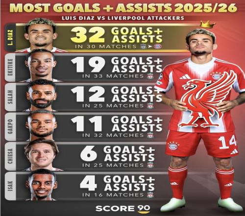 最近Score 90整理了2025/26赛季的进球加助攻榜,迪亚斯这份30场32次的数据一下把对比拉满:同一份统计里,利物浦队内不少攻击手的数字明显低一档。更关键的是,这组数字还是发生在他已经离队、球队又需要边路稳定产出的节点上。放到现在回头看,利物浦当初为什么愿意放人、这笔交易值不值,就成了绕不开的话题。