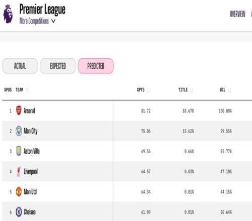 Opta超级计算机的模型也计算了各队进入“英超前四”的概率。尽管阿斯顿维拉近期状态有所下滑,但由于前期积累的优势,他们仍有85.7%的高概率进入前四;利物浦的概率为47.1%,而曼联紧随其后,概率为 44.1%。
