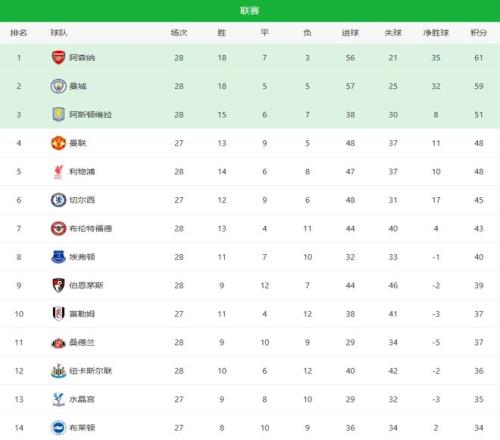 第一,曼城继续压迫阿森纳,争冠进入白热化阶段。