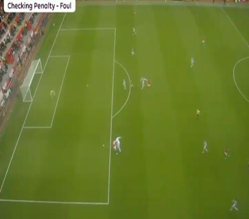 马奎尔长时间围住主裁判争辩,随后,视频助理裁判介入判罚,并且要求主裁判回看慢镜头。从慢镜头来看,拉克鲁瓦禁区外就伸手拉人,但进入禁区之后仍然没有松手,导致库尼亚倒地。